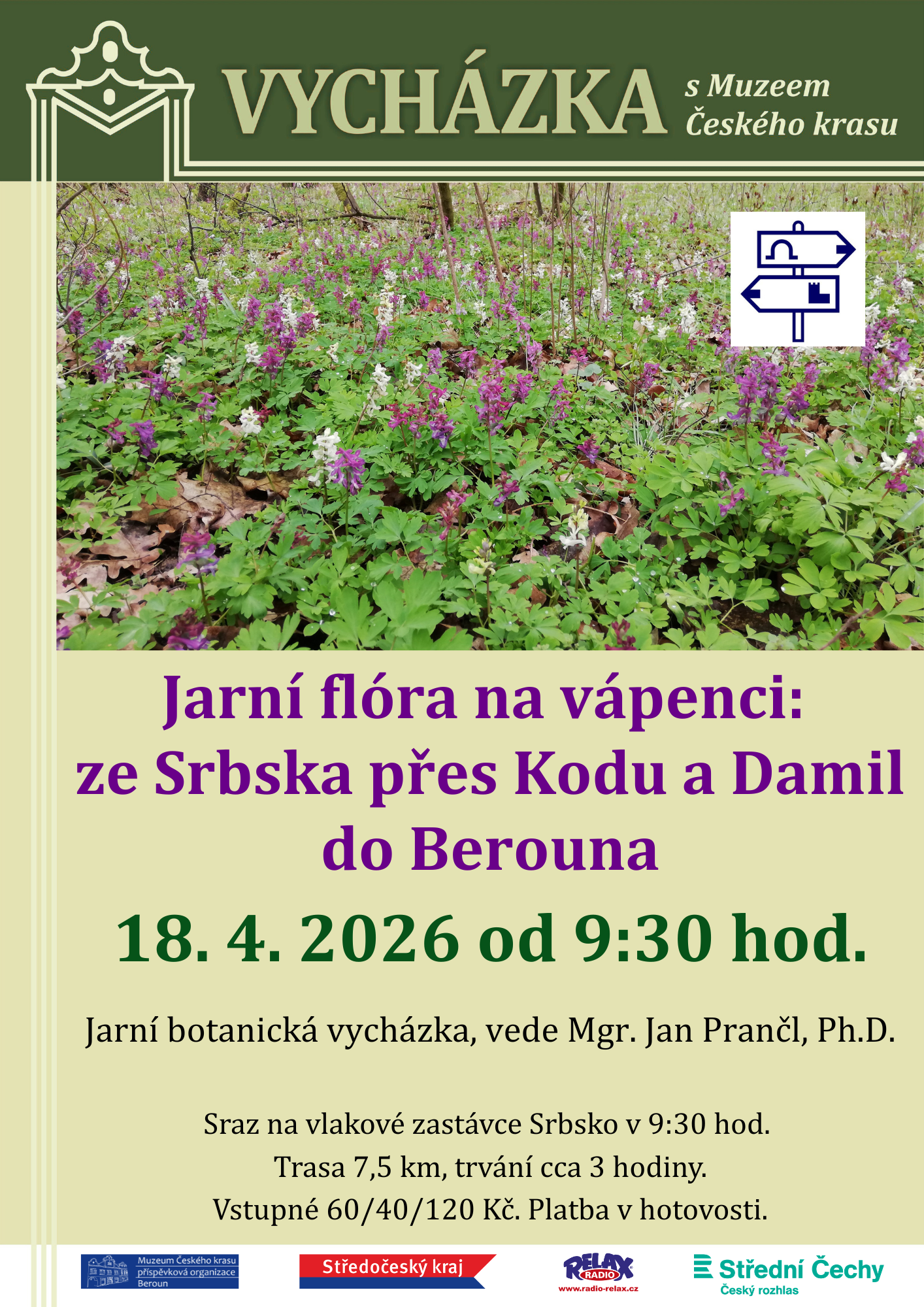 Vydejte se na jarní botanickou procházku jednou z nejkrásnějších částí Českého krasu. Trasa povede ze Srbska přes rezervaci Koda s travertinovými kaskádami a pestrou květenou vápencových svahů na vrchu Damil u Tetína až do Berouna. V dubnovém čase zde rozkvétají jarní byliny typické pro vápencové lesy a skalní stepi, které společně objevíme a krátce představíme. Exkurze je určena široké veřejnosti – stačí chuť se dívat kolem sebe.