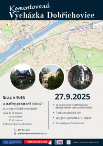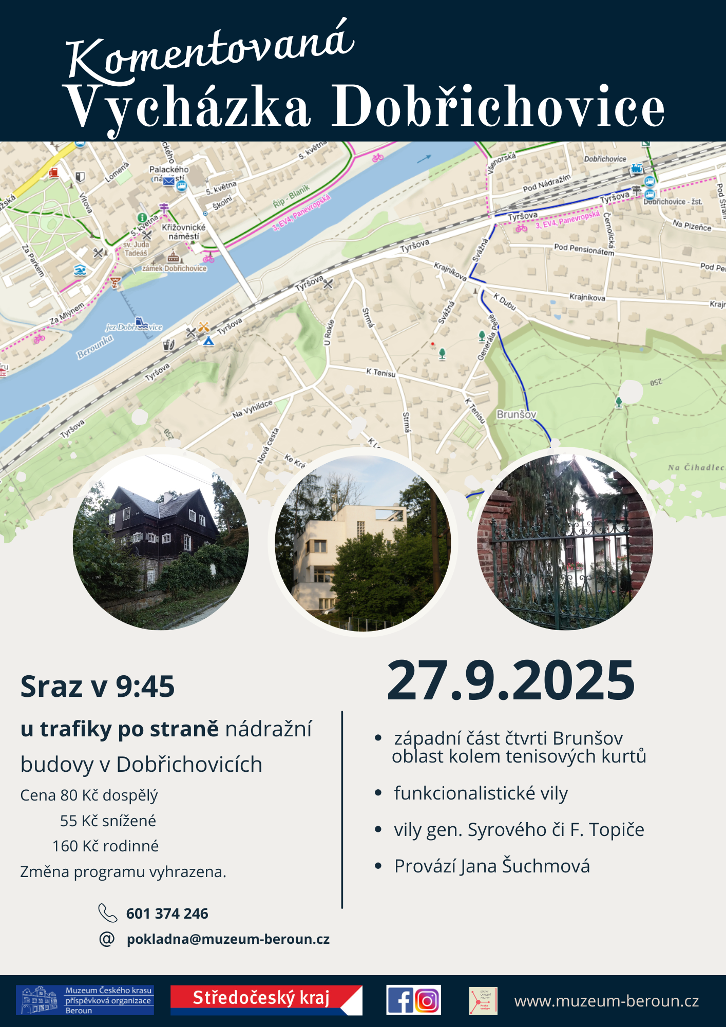 Tentokrát se vydáme procházkou do západní části čtvrti Brunšov, kde se mezi vilami z přelomu 19. a 20. století nalézají stavby z let 30. a 40., kdy byl historismus nahrazen funkcionalismem. Jména majitelů vil, které si ukážeme tentokrát, budou poněkud zvučnější – každý jistě slyšel o generálu Janu Syrovém a jeho cestě od hrdiny k člověku odsouzenému za velezradu. A nejspíš každý někdy měl v ruce knihu z vydavatelství Františka Topiče. S nimi a též dalšími dobřichovickými „vilaři“ se při procházce seznámíte.