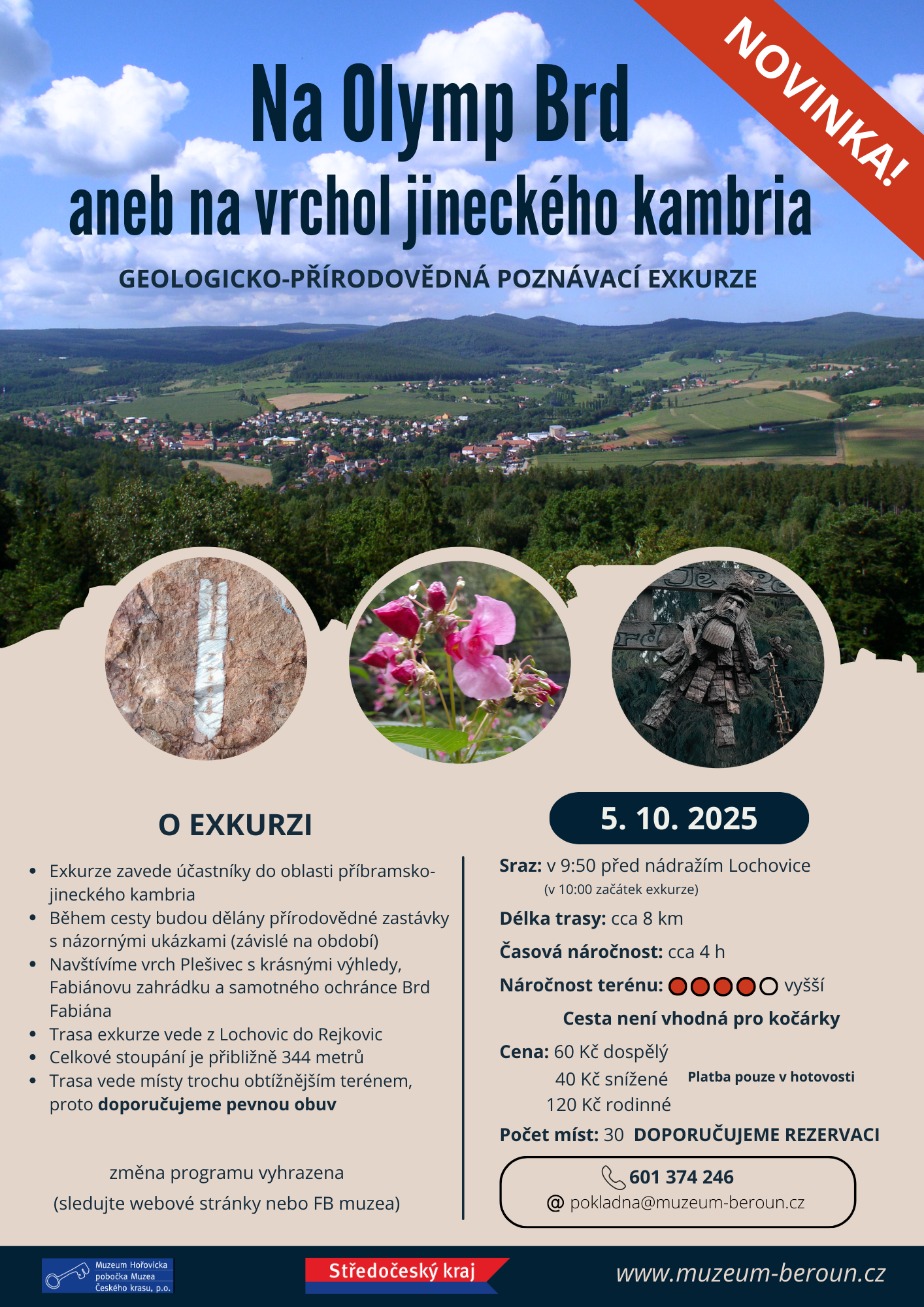 Geologicko-přírodovědná poznávací exkurze zavede účastníky do oblasti příbramsko-jineckého kambria. Během cesty budou dělány přírodovědné zastávky s názornými ukázkami (závislé na období), navštívíme vrch Plešivec s krásnými výhledy, Fabiánovu zahrádku a samotného ochránce Brd Fabiána. Trasa exkurze vede z Lochovic do Rejkovic, Celkové stoupání je přibližně 344 metrů a délka 8 km. Časová náročnost vycházky je cca 4 h. Trasa vede místy trochu obtížnějším terénem, proto doporučujeme pevnou obuv. Cesta není vhodná pro kočárky.
